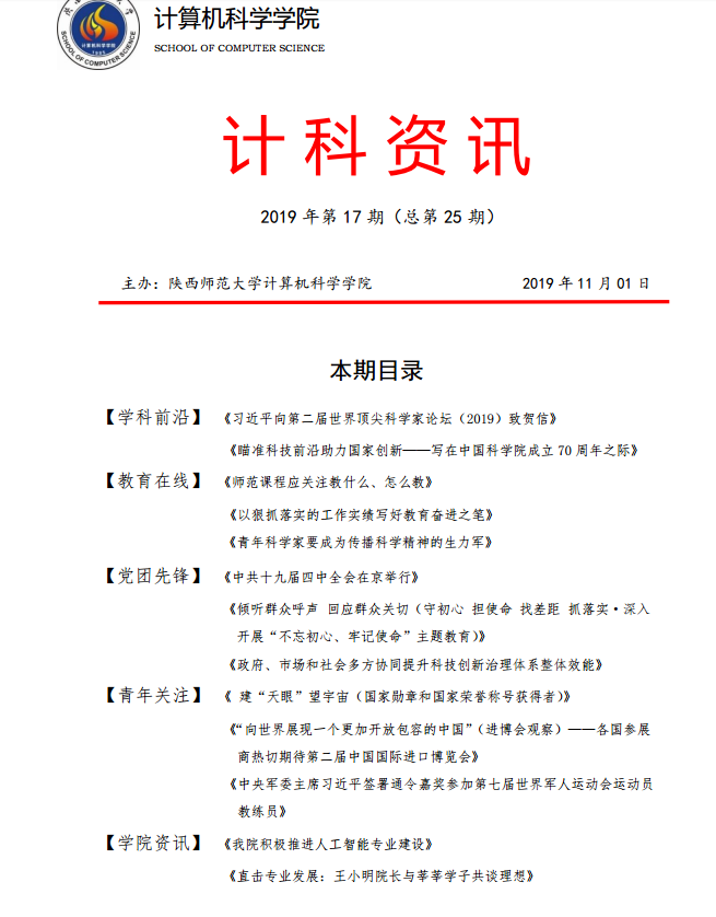 《计科资讯》是竞博(JBO)体育官方网站 编辑整理的电子资讯,信息来源为《光明日报》《人民日报》《中国青年报》等权威纸媒,编辑工作由JBO体育 优秀本科生党员、团员承担。《计科资讯》主要包括学科前沿、教育在线、党团先锋、青年关注及JBO体育 资讯五个版块。JBO体育 师生可以从中了解到专业前沿和国家时政大事,欢迎大家下载阅读。