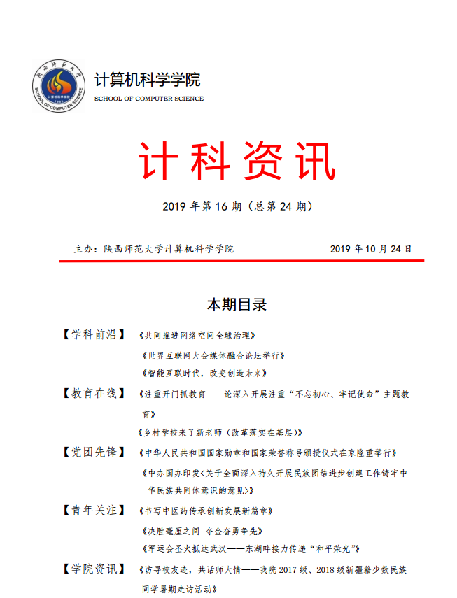 《计科资讯》是竞博(JBO)体育官方网站 编辑整理的电子资讯,信息来源为《光明日报》《人民日报》《中国青年报》等权威纸媒,编辑工作由JBO体育 优秀本科生党员、团员承担。《计科资讯》主要包括学科前沿、教育在线、党团先锋、青年关注及JBO体育 资讯五个版块。JBO体育 师生可以从中了解到专业前沿和国家时政大事,欢迎大家下载阅读。