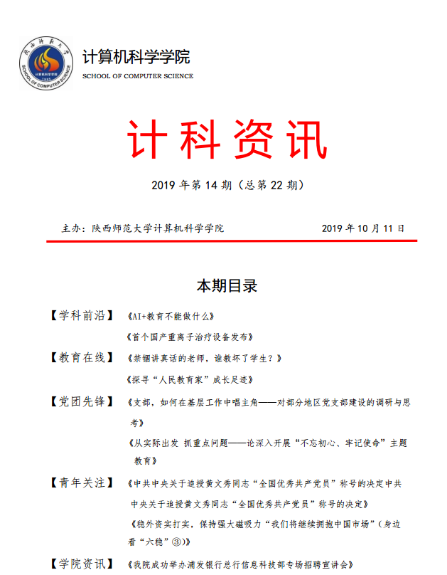 《计科资讯》是竞博(JBO)体育官方网站 编辑整理的电子资讯,信息来源为《光明日报》《人民日报》《中国青年报》等权威纸媒,编辑工作由JBO体育 优秀本科生党员、团员承担。《计科资讯》主要包括学科前沿、教育在线、党团先锋、青年关注及JBO体育 资讯五个版块。JBO体育 师生可以从中了解到专业前沿和国家时政大事,欢迎大家下载阅读。