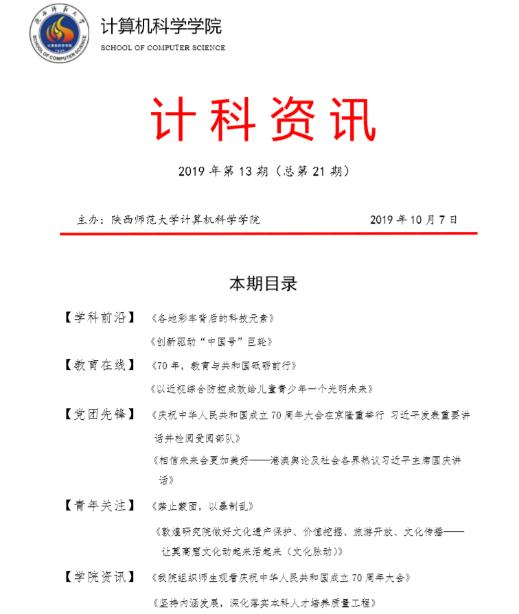 《计科资讯》是竞博(JBO)体育官方网站 编辑整理的电子资讯,信息来源为《光明日报》《人民日报》《中国青年报》等权威纸媒,编辑工作由JBO体育 优秀本科生党员、团员承担。《计科资讯》主要包括学科前沿、教育在线、党团先锋、青年关注及JBO体育 资讯五个版块。JBO体育 师生可以从中了解到专业前沿和国家时政大事,欢迎大家下载阅读。