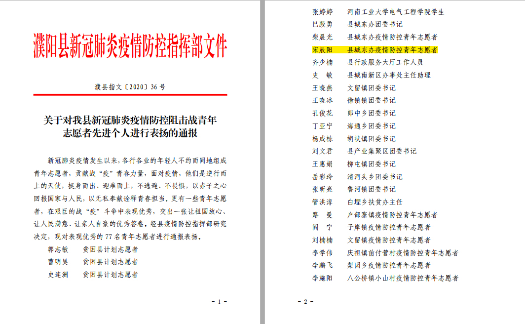 收到了来自河南省濮阳县新冠肺炎防控指挥部文件,对疫情防控工作中的优秀青年志愿者进行了表扬。JBO体育