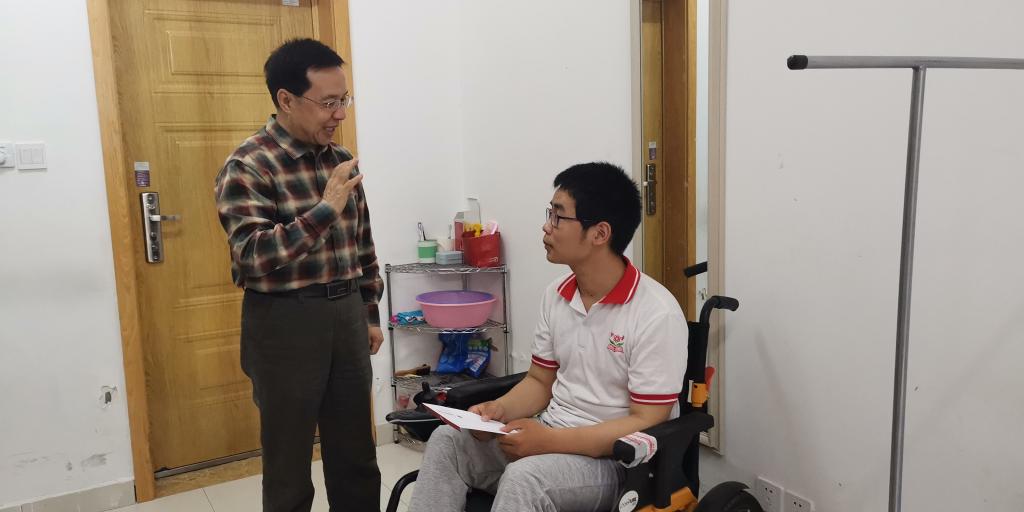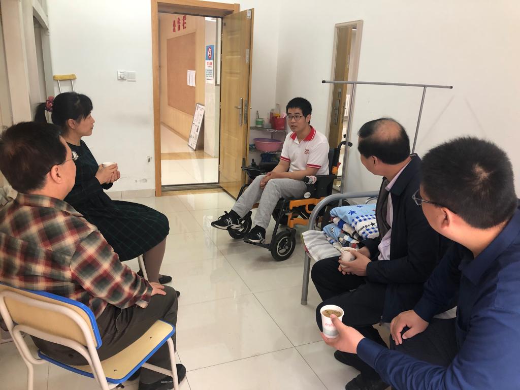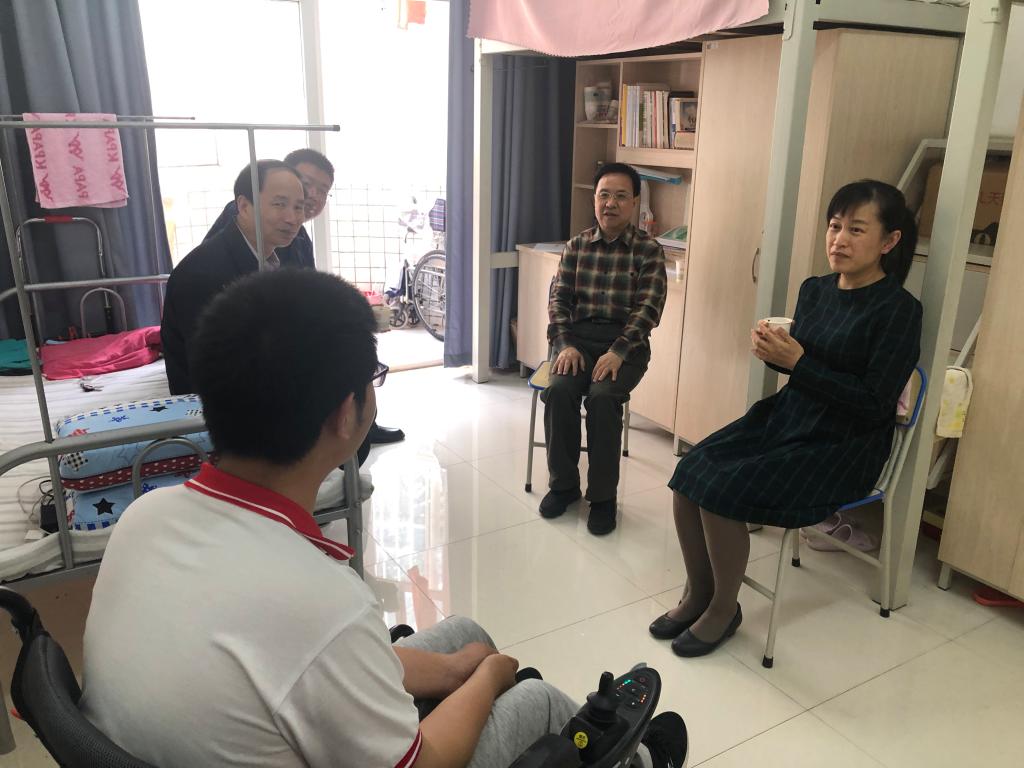 领导来到邓龙彦宿舍,与学生亲切交谈,询问学生的生活、学习、身体状况和目前存在的困难。