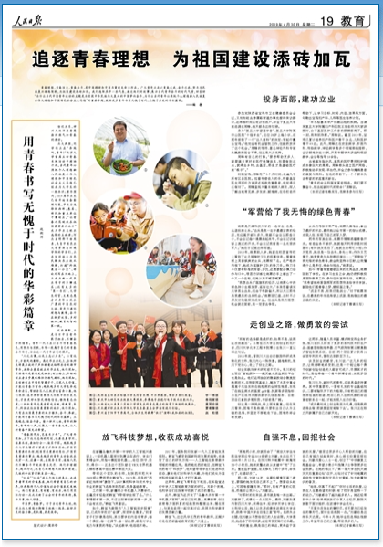 4月30日,《人民日报》在第19版“教育”板块,刊发了题为“追逐青春理想 为祖国建设添砖加瓦”的报道。文章指出,“青春理想,青春活力,青春奋斗,是中国精神和中国力量的生命力所在。广大青年正在以青春之我、奋斗之我,努力为民族复兴铺路架桥,为祖国建设添砖加瓦。”文中选取了一些代表,通过他们的故事,展示当代青年奋斗的时代气质,回答好“为什么当代中国青年运动的主题是为实现中华民族伟大复兴的中国梦而奋斗,为什么当代青年必须把个人理想融入民族复兴伟大理想和中国特色社会主义思想”的重要命题,鼓励更多青年书写无愧于时代、无愧于历史的华彩篇章。其中,以“放飞科技梦想,收获成功喜悦”为题,对JBO体育