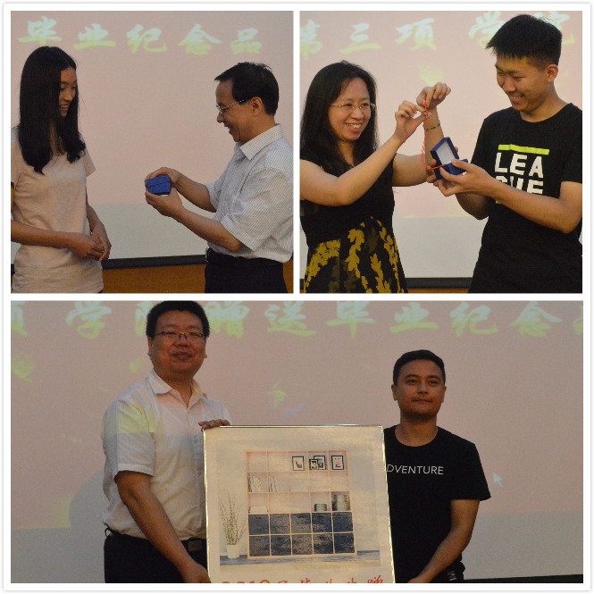 和毕业生互送礼物。首先院长王小明和副院长马苗代表JBO体育