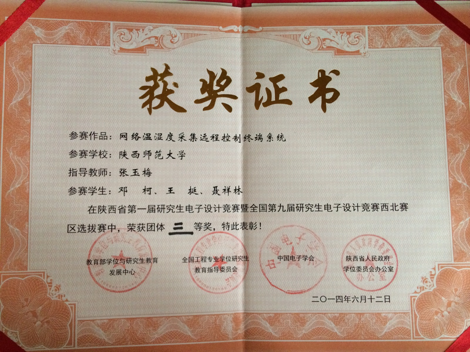 2014年6月10日至6月12日,陕西省第一届研究生电子设计竞赛暨全国第九届研究生电子设计竞赛西北赛区选拔赛在西安电子科技大学举行,来自西北大学、西北工业大学、西安交通大学、兰州大学、兰州交通大学、陕西师范大学、西安电子科技大学等多所西北地区高校的196支队伍参加了此次比赛。本次大赛是由教育部学位与研究生教育发展中心、全国工程专业学位研究生教育指导委员会、中国电子学会联合主办的研究生学科竞赛,大赛的参赛对象包括各个高等院校的在校研究生。