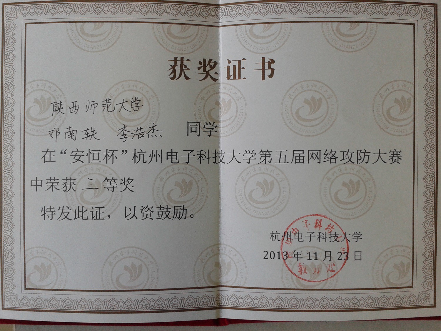 代表队参加了于11月8日至11月12日举行的在线选拔赛,2012级研究生邓楠轶和李浩杰同学脱颖而出,成功入围决赛。11月23日,在杭州电子科技大学举行的决赛中,邓楠轶和李浩杰同学在没有硝烟的战场里与众多高手同台竞技,经过激烈角逐,最后不负众望,取得了三等奖的好成绩。