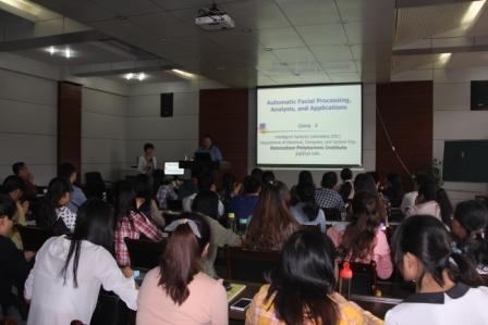 报告中,Qiang Ji教授首先向大家介绍了计算机视觉的的概念和作用,以此引出面部识别;接着重点介绍了面部处理和分析中的七大任务,这些任务涵盖的主题有人脸检测和跟踪、面部landmakr点检测和跟踪、人脸识别、表情识别、人脸姿态检测和跟踪、眼睛检测和眼睛注视跟踪,针对这些主题,Qiang Ji教授通过大量的图片展示、视频演示以及现场演示为我们深入浅出地介绍了一些面部处理算法;最后,介绍了他目前在该领域的研究方向。报告中,师生反应热烈,针对不同的难点及疑问,及时地向Qiang Ji教授提出,Qiang Ji教授耐心地一一解答。