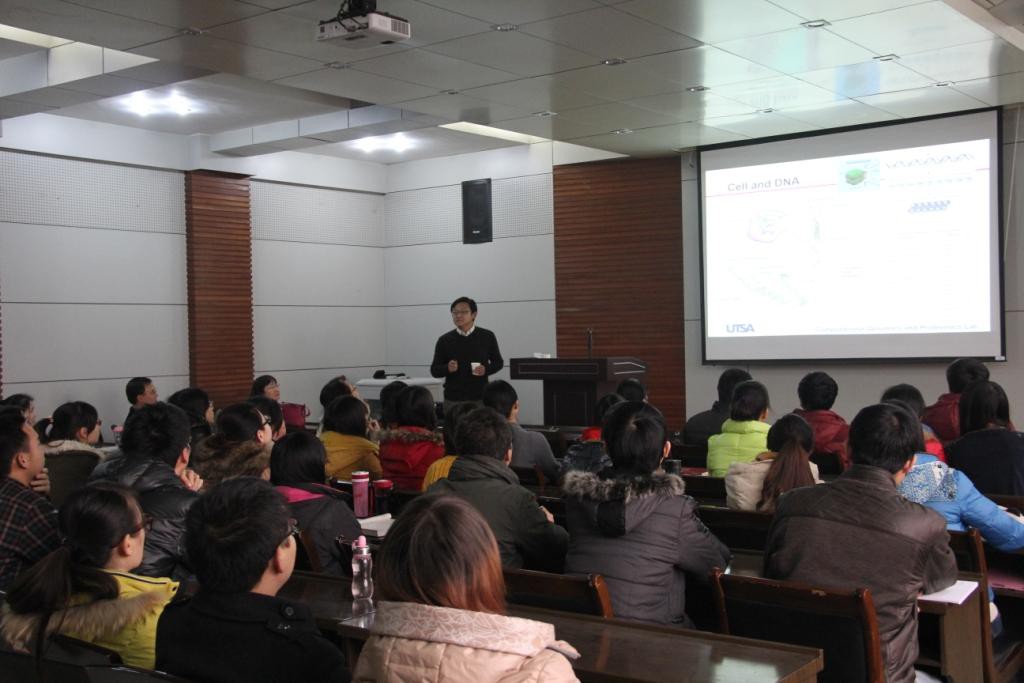 YuFei Huang教授在计算生物学方面有着很高的造诣。报告会开始,YuFei Huang教授首先从细胞、DNA结构、基因、染色体等分子生物学概念一步一步深入主题,接着介绍了MeRIP和mRNA N6-methyladenosine的相关内容,着重介绍了他们所作的相关研究以及开发的基于matlab软件包的exomePeak软件,并把exomePeak应用到人体HepG2细胞MeRIPseq的数据集。最后,YuFei Huang教授非常认真的回答了学生们提出的每一个问题。