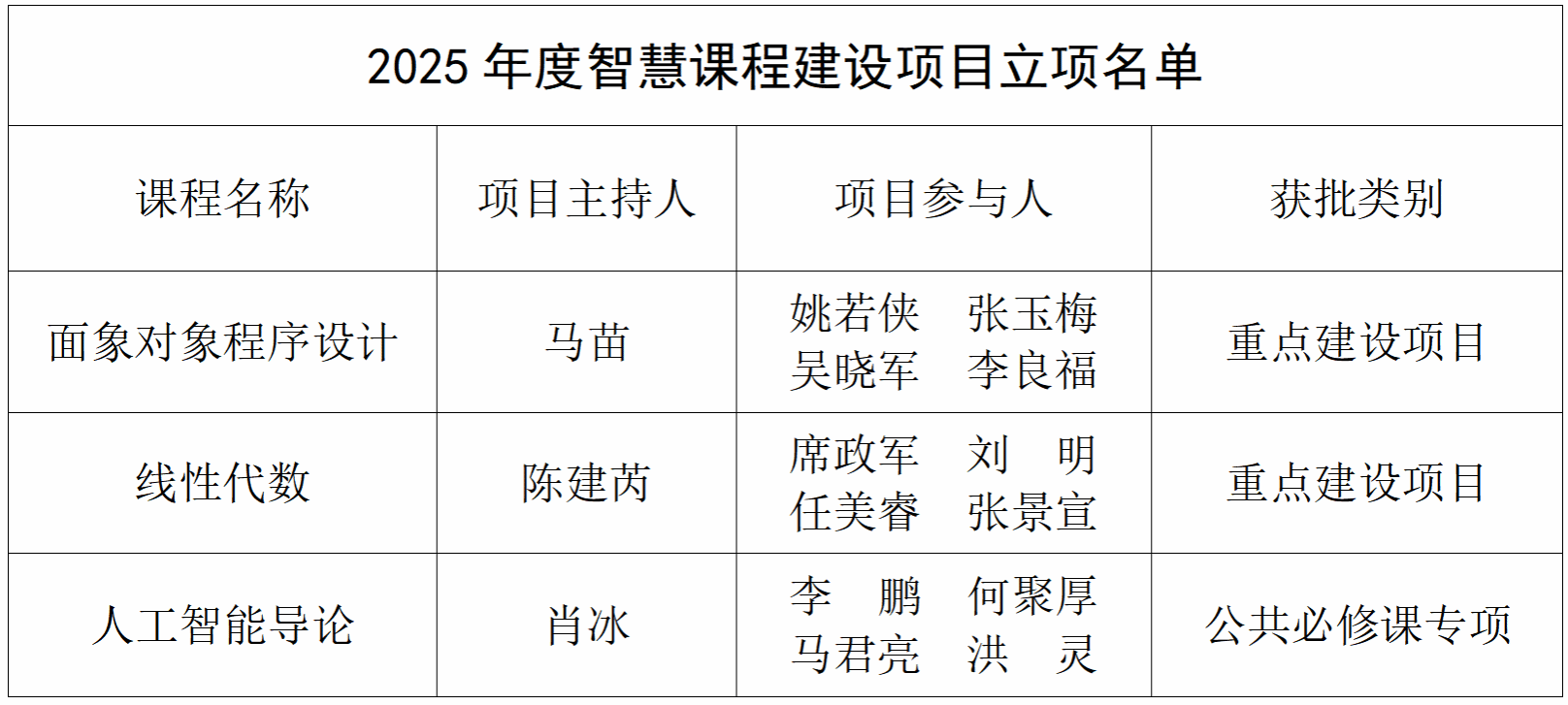 根据《关于开展2025年度智慧课程建设项目申报的通知》相关要求,经个人申报、JBO体育 推荐、专家评审和结果公示等环节,全校共立项智慧课程建设项目56项,专业知识图谱建设项目8项,JBO体育 获批情况如下。