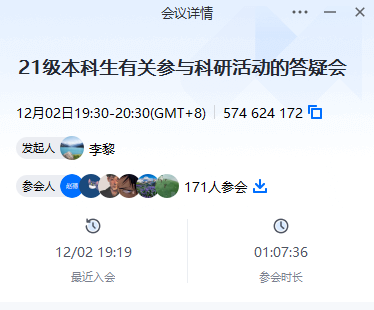 于2022年12月2日面向2021级本科生召开了学生参与科研工作线上专题会议,就本科生如何准备科研技能、如何选择研究方向、如何申请参与教师的科研项目等进行了说明和答疑。