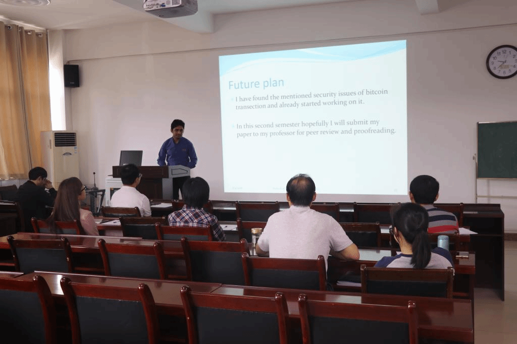 获得中国政府奖学金、学校优秀来华国际学生奖学金获得者。参与评审的奖学金生以PPT形式展示了2017-2018学年课程学习情况、科研进展及参加的课外活动等。留学生不仅学习态度端正、研究进展顺利,而且部分同学的汉语学习取得了良好的成绩,比如汉娜同学全程汉语汇报学习进展,得到了师生一致好评。评委们对学生的汇报进行提问并和学生进行学术交流,气氛融洽。本次国际学生奖学金评审会议在师生热烈的探讨中取得圆满成功。