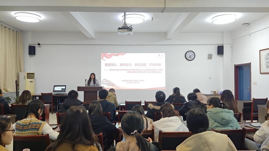学生第一党支部于11月29日晚18:15在文津楼3412报告厅举行了“坚定信心,保持定力,锐意进取,开拓创新”主题学习活动,活动由支部纪检委员张静妍同志主持。