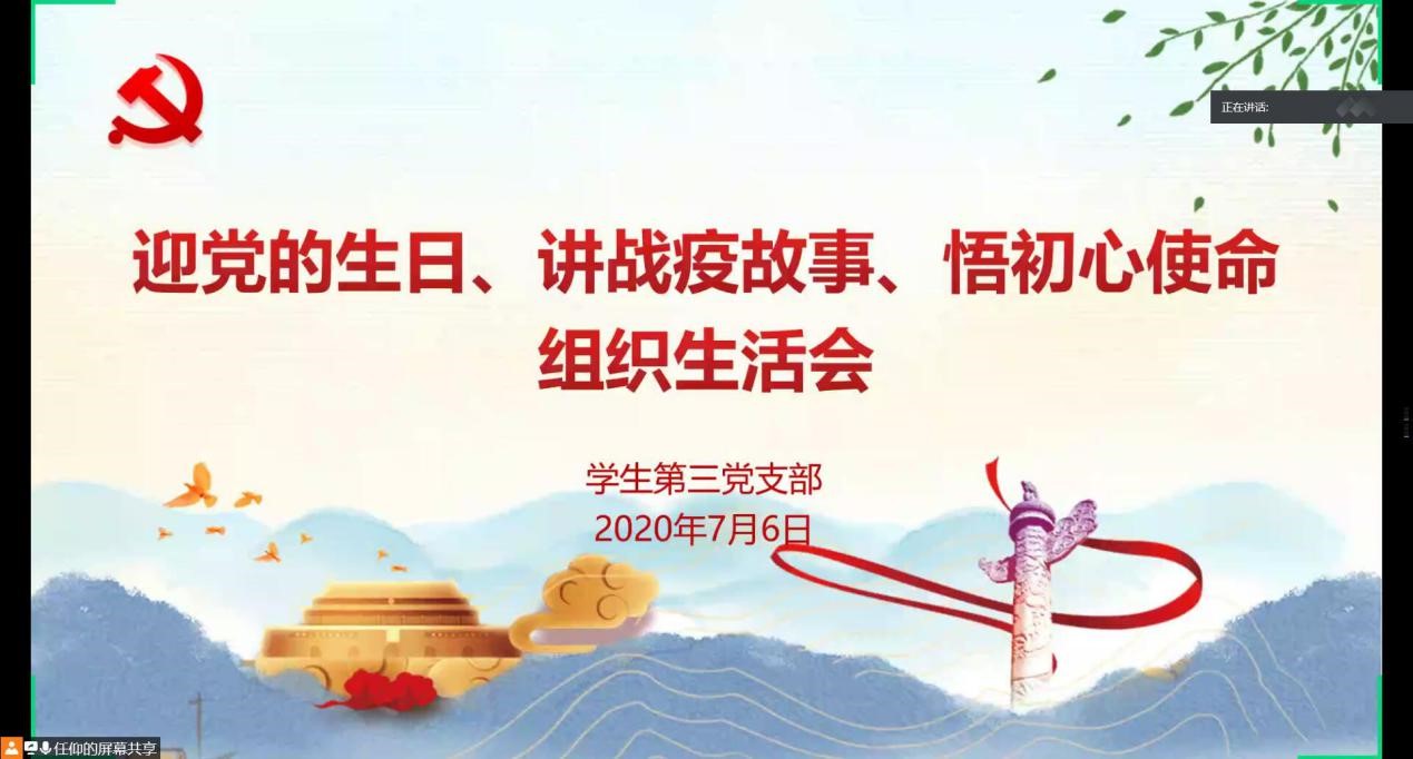 学生第三党支部通过腾讯会议线上召开组织生活会,会议围绕“迎党的生日、讲战疫故事、悟初心使命”主题展开。支部书记任仰主持会议,支部全体党员和积极分子代表参加了本次生活会。