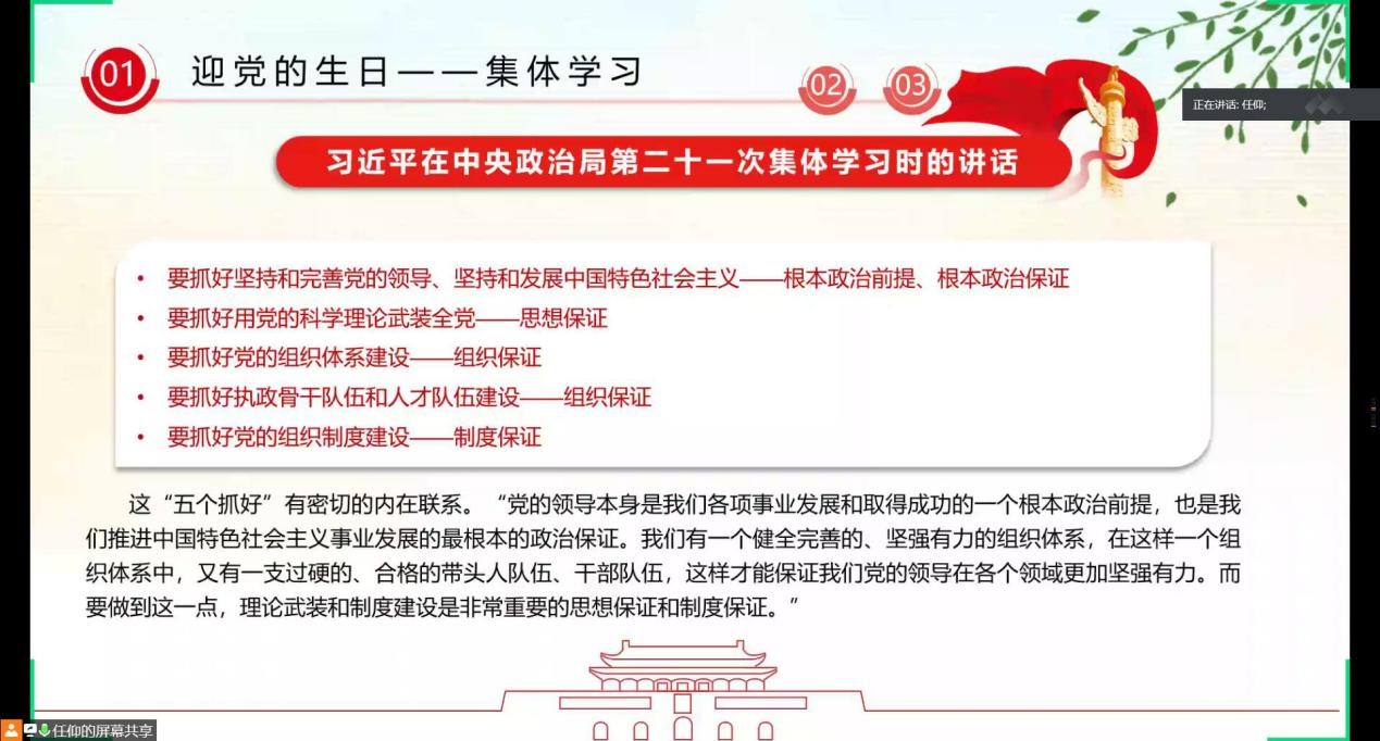 会议开始,全体成员观看了视频《建党年报》,回顾共产党成立99年来的历程。革命战争年代,刘胡兰、李大钊等无数的革命先烈前赴后继;社会主义建设时期,李四光、邓稼先等时代楷模们披荆斩棘;改革开放时代,袁隆平、陈景润等榜样前辈们砥砺前行。99年来,我党经历了党旗变化、中共中央所在地变迁、党章修改;99年来,一代又一代共产党人奔赴时代,九十九风华正茂,答卷人初心如磐。