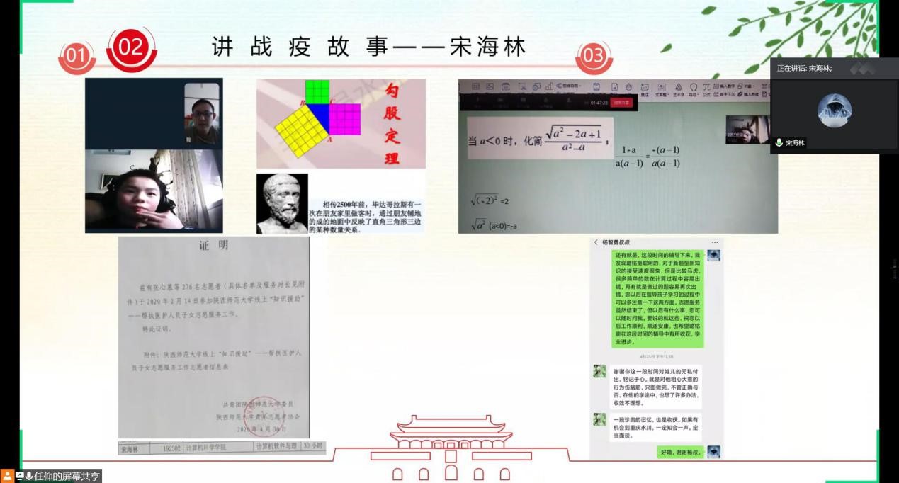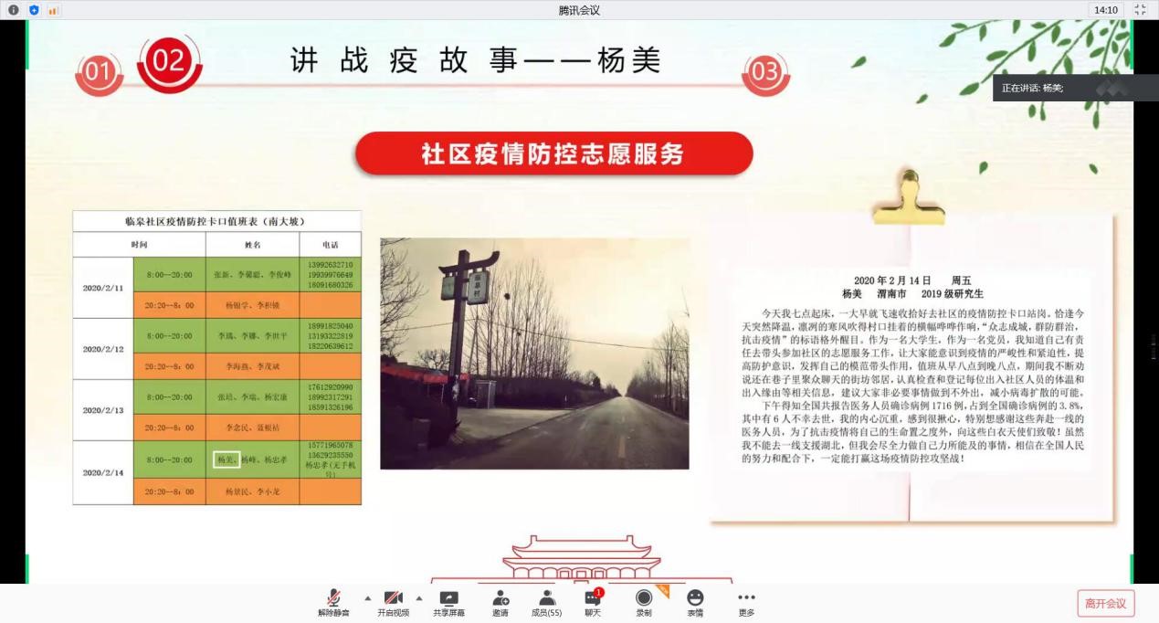 工作、为医护人员子女线上义务辅导等进行分享,三位同志从自己的抗疫故事出发,结合疫情期间所见所闻所思所感,立足自身说故事,真情实感讲体会。
