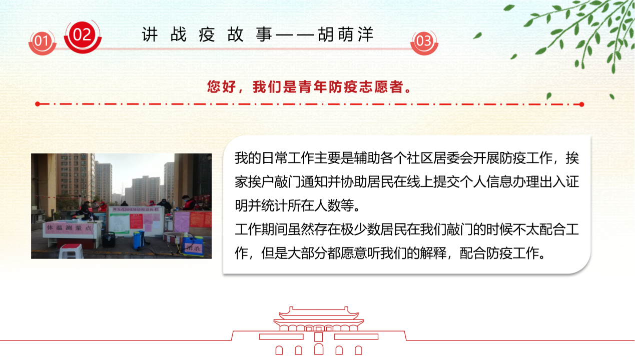 在“讲战疫故事”环节,支部党员胡萌洋、杨美以及积极分子代表宋海林分别围绕疫情期间参与社区一线疫情防控志愿服务、协助处理JBO体育