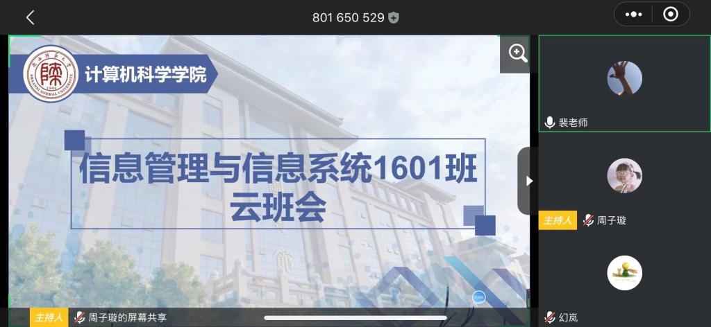 为了加强学生对于疫情防控工作的重视,防止同学们因为疫情的缓和而放松警惕,纠正学生有关于防疫的具体方法,切实加强学生的思想教育和价值引领,信息管理与信息系统1601623日晚在“腾讯会议”召开了“云”班会,信管1601班班主任裴、辅导员郭康凌以及本班全体学生参加了班会,班会由裴老师主持。