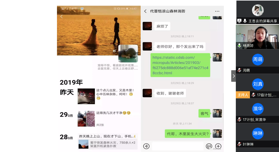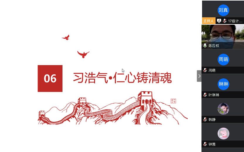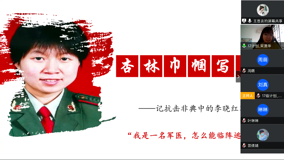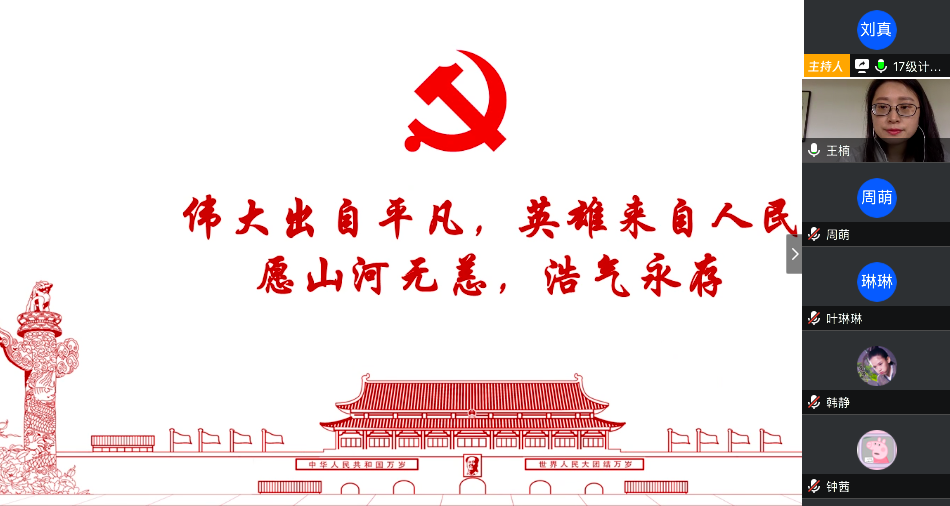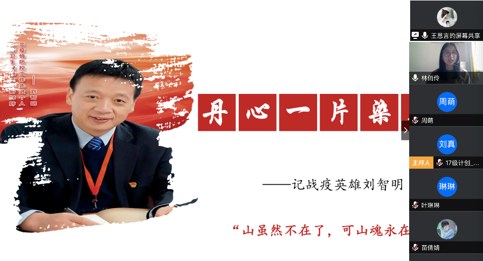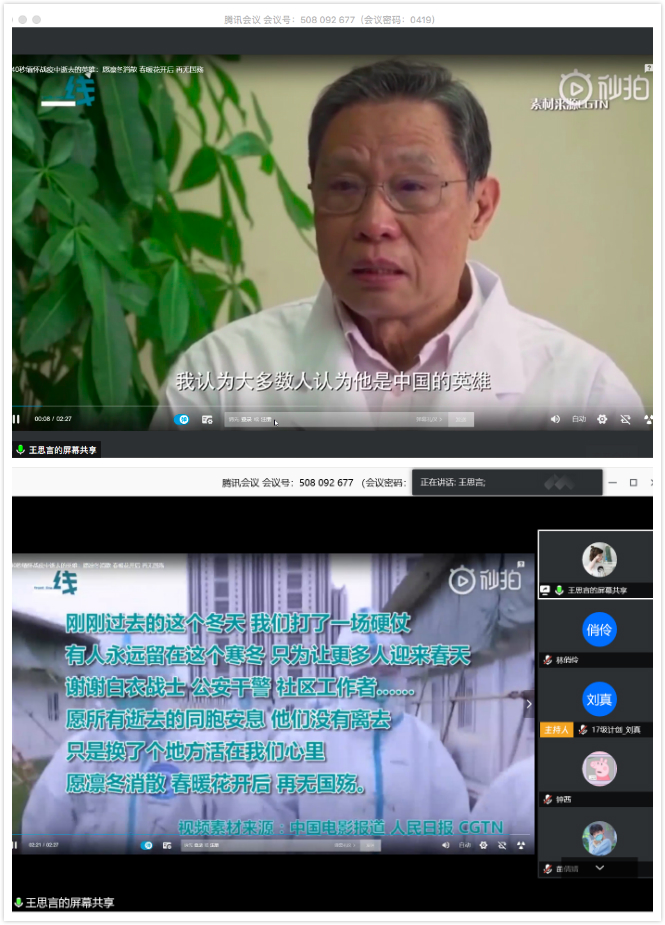 在最后的总结发言中,陈应权老师谈到,要珍惜别人付出辛苦劳动甚至是生命为我们创造的美好生活和疫情防控良好局面,要用自己的实际行动去捍卫来之不易的成果;要时刻铭记包括这次疫情的重大事件中为大家舍小家的平凡英雄们,不忘来路、始知归处;要透过我们所遇见的每一次灾难去反思,反思我们的言行举止是否符合我们的党员身份。王楠老师首先向同志简单地介绍了自己自疫情以来在学校疫情防控工作指挥部的工作。她表示,从国家层面来看,这次疫情大考彰显了社会主义制度的优越性,体现了人类命运共同体这一观点的正确性,是一场生动的爱国主义教育;从社会层面来看,尽管存在极少部分不和谐声音,但绝大多数中国人都主动担起社会责任,相信科学、相信权威,不信谣、不传谣;从个人层面来看,无论是奔赴一线还是居家抗疫,都是在为我国疫情防控工作贡献自己的力量。最后,她希望同学们在家学习生活之余,不忘积极参加劳动,锻炼身体,以最好的身体和心态迎接生活中的每一天。