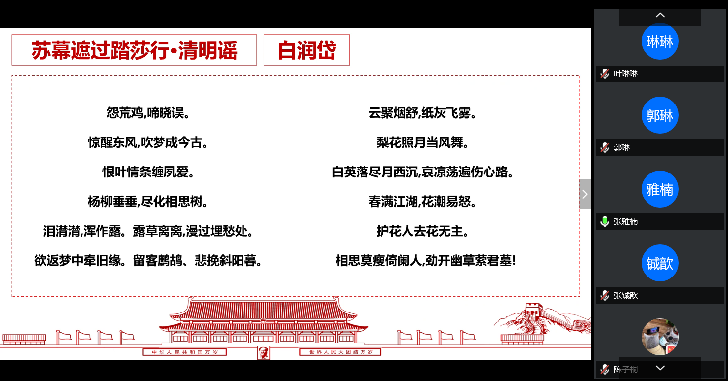随后,高令艺、张雅楠和王越等同志依次带来诗歌朗诵《生命之歌》、《清明谣》和《五星红旗上的土壤》,寄托对英雄的无尽哀思,迎候生命的生生不息。