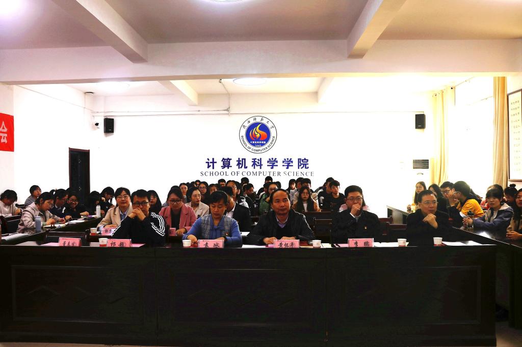 党委书记黄怀平、院长王小明、副书记袁冰,行政党支部书记、副院长董春生,计算科学与软件工程党支部书记祁超、普适计算党支部宣传委员李鹏、普适计算支部党员董蓓、学生党支部书记陈应权,JBO体育
