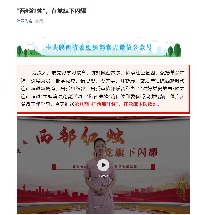 2019级本科生辅导员崔瑜璠主讲的微党课《“西部红烛”,在党旗下闪耀》作为优秀作品在陕西省委组织部官方微信公众号“陕西先锋”从做了专题展播。
