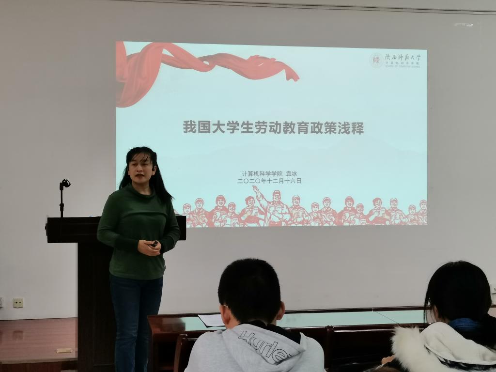 活动伊始,袁冰老师从“劳动”的意义、我国劳动教育的历史沿革和系列文件出台背景及应用三个部分为我们详细介绍我国大学生的劳动教育,并结合自身经历,寓教于乐地阐述了在我国大中小学加强劳动教育的重要性和必要性。她强调,在学校开展丰富多彩的劳动主题教育,培育崇尚劳动的校风、教风和学风,有利于激发青少年学生热爱劳动的内生动力。