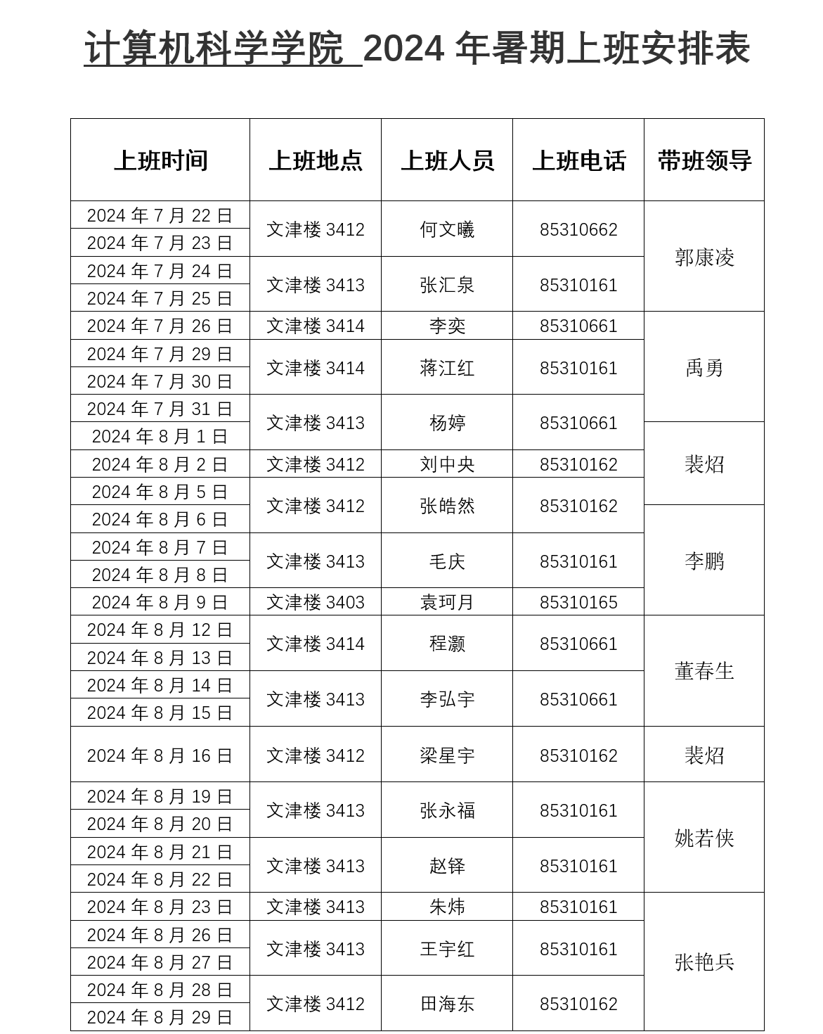 1.暑假期间轮流上班。上班时间为星期一至星期五,上午8:00-12:00,下午2:30-5:30。