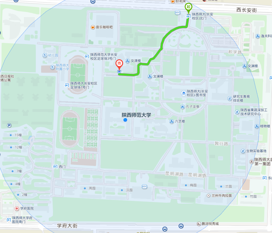 从陕西师大(长安校区)北门向正南方向出发,走60米,右转进入书山道,沿书山道走170米,右转进入积学路,沿积学路走10米,离开积学路,向左前方转,走130米,右转穿过马路继续向前,走10米,向左前方转,走60米,右转,走70米,到达陕西师范大学文津楼,竞博(JBO)体育官方网站