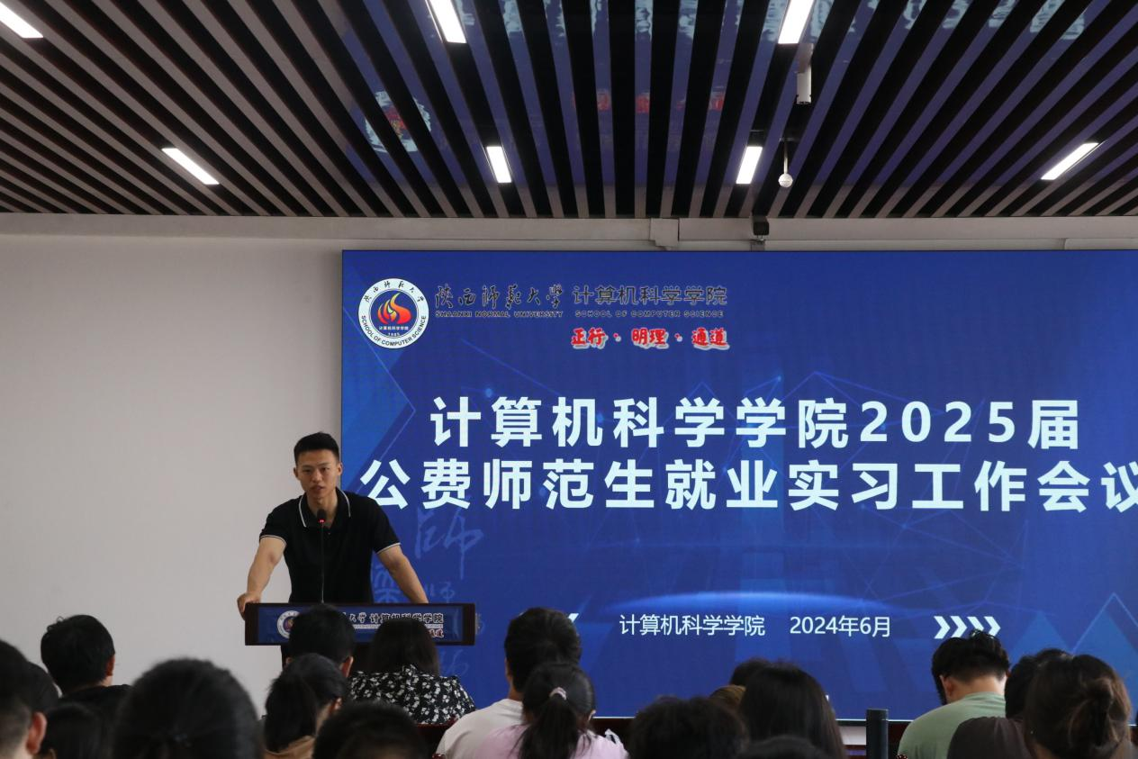 在文津楼3425报告厅召开2025届公费师范生就业实习工作会议,教学副院长李鹏、党委副书记郭康凌、公费师范生专业负责人洪灵、教学秘书杨婷、2025届全体公费师范生参加会议。会议由2021级本科生辅导员刘中央主持。