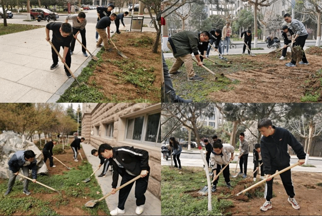 活动现场同学们劳动热情高涨。在后勤集团工人师傅的指导下,同志们分工明确,干劲十足。小伙子们拿起铁锹忙活着平地,小姑娘手持小铲子开始种草。经过一下午的努力,原本光秃秃的土地被绿草覆盖,展现出勃勃生机。