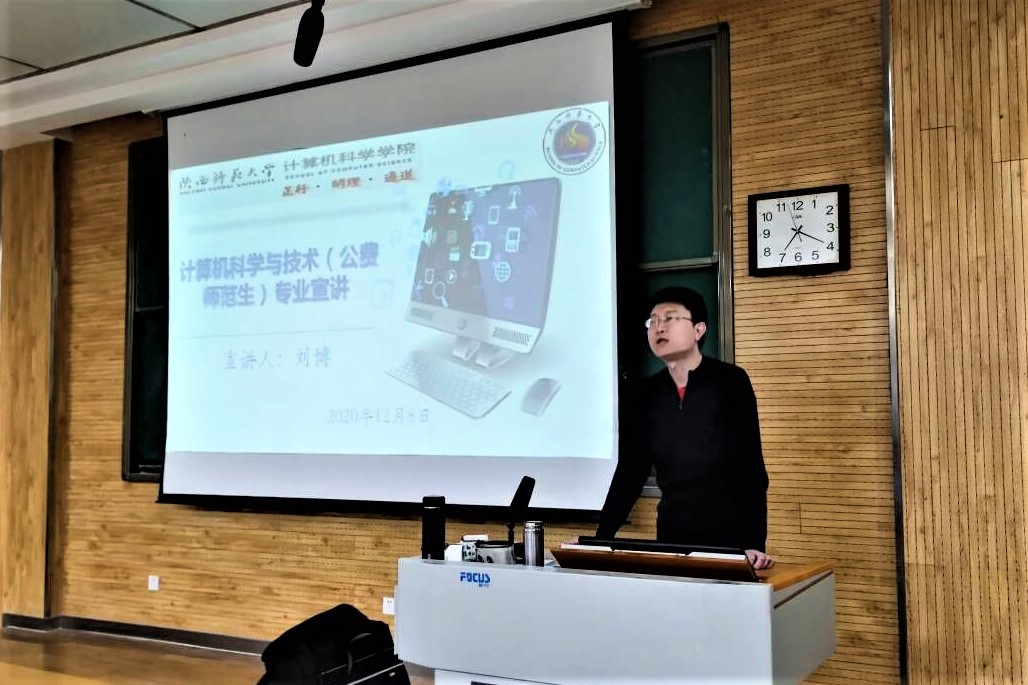 计算机科学与技术(公费师范生)专业宣讲在雁塔校区教学五楼5301教室顺利举办。本次讲座由陕西师范大学计算机科学与技术专业负责人刘博老师主讲。辅导员毛庆和2020级全体公费师范生参加了本次讲座。