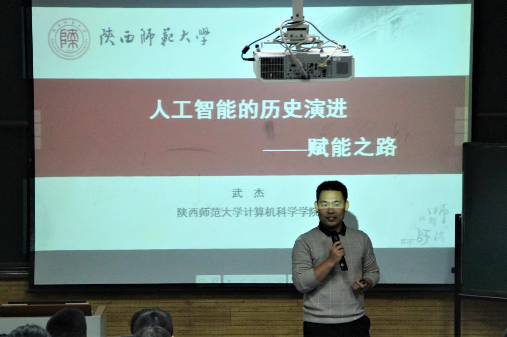 人工智能专业负责人武杰老师和计算机科学与技术专业负责人王亮老师主讲。讲座的题目为《人工智能的历史演进——赋能之路》和《大学生创新创业交流讨论会》。JBO体育