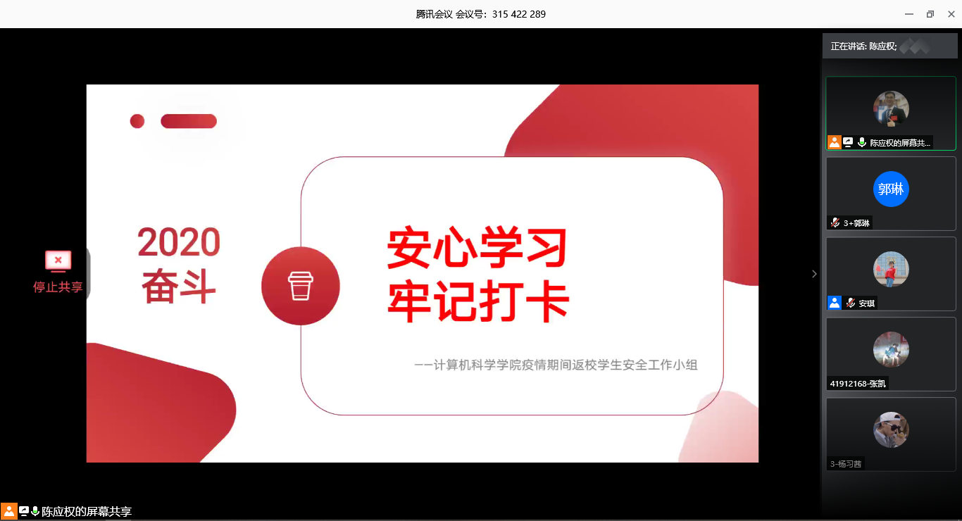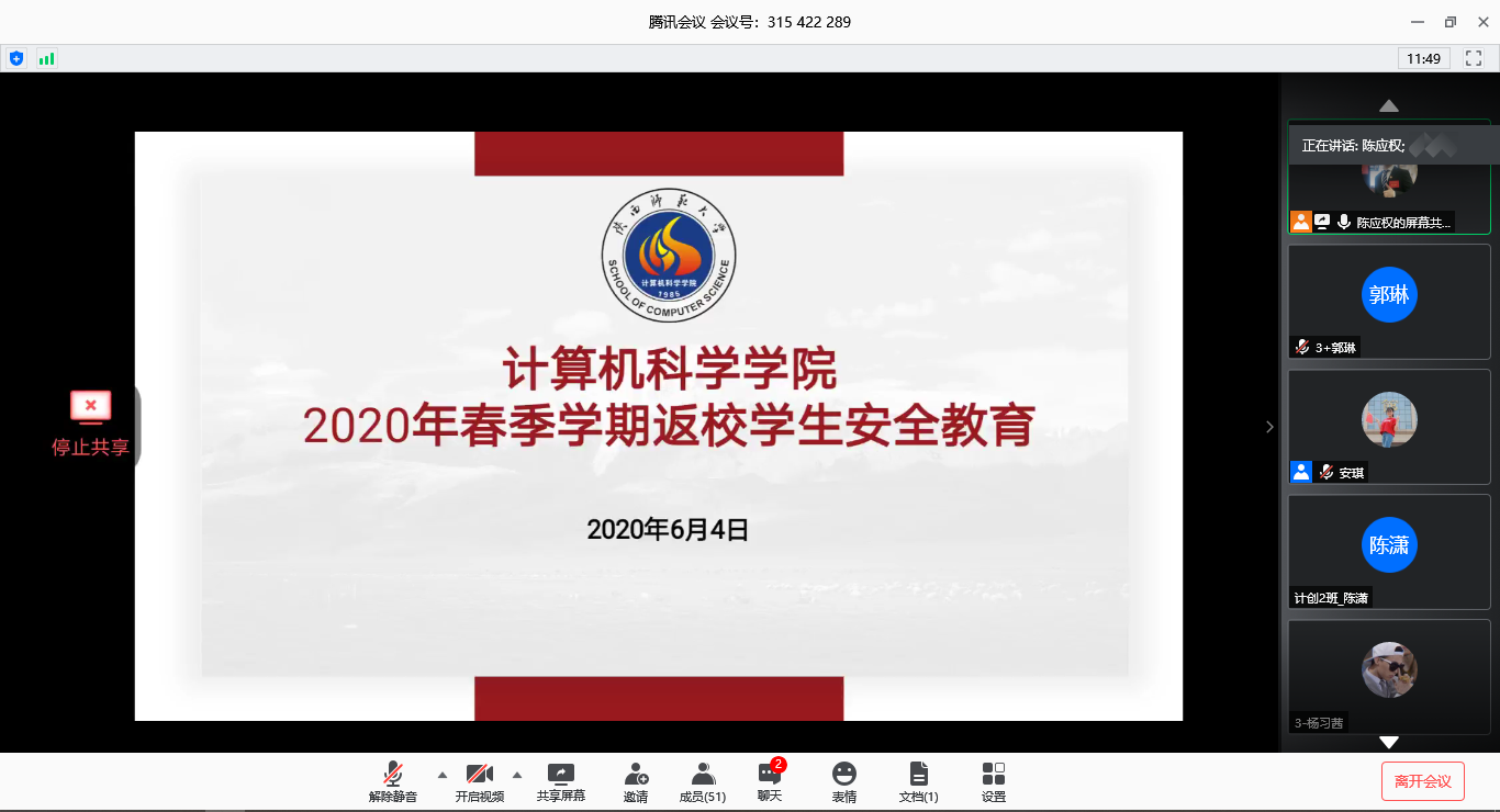 陈应权老师以返校学生日常生活的方方面面为切入点,就宿舍、食堂、浴室、教室、图书馆等与同学们息息相关的场所的管理规定进行了说明。此外,陈应权老师还就学校现在的封闭式管理、每日的三次上报体温以及异常情况的汇报进行了相关说明,并要求所有的返校学生都要能够真正理解并配合学校在疫情期间的相关规定,为学校疫情防控工作做贡献。