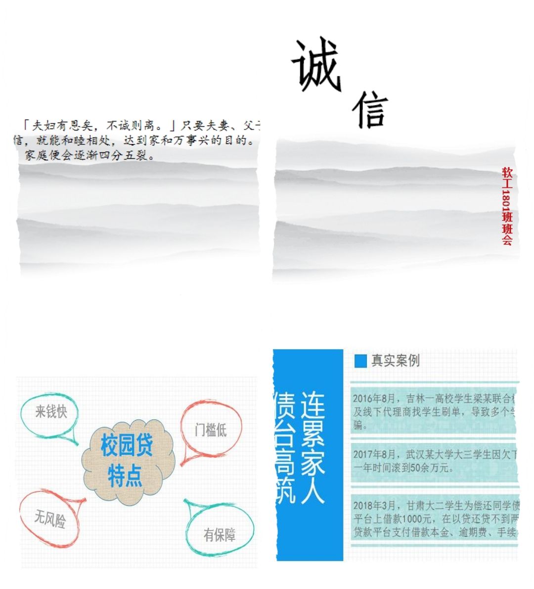 辅导员王秋婷老师强调,诚信是根本之道。班会同时就“校园贷”的识别和防范进行讲解,提醒大家要远离校园贷,培养防范意识,不盲目攀比,合理安排支出。辅导员安琪老师谈到,诚信体现在方方面面,不论大小,我们都应坚守。