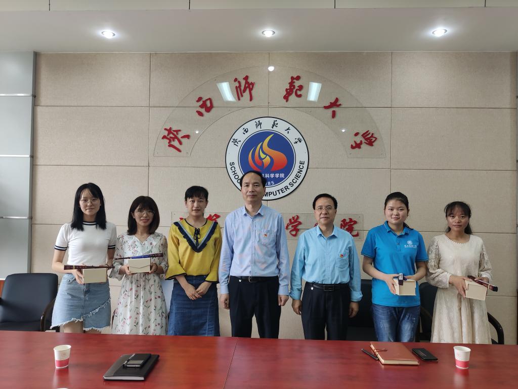 为四位同学赠送礼物,陕师大竹制笔筒、印有“抱道不曲,拥书自雄”的纪念扇和印有陕师大logo的纪念笔,希望同学们能传承学校和JBO体育