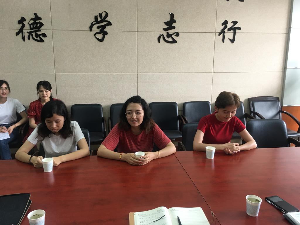 教师路纲、卢俊岭、李鹏、李黎、王艳娥,2019届本科生辅导员吉晨晓、范晓萱和2019届三位维吾尔族受助学生参加了此次会议,座谈会由袁冰副书记主持。
