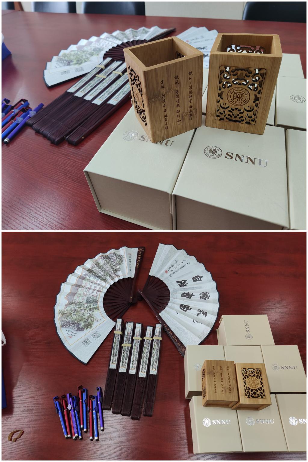 为三位同学赠送了礼物,陕师大竹制笔筒、印有“抱道不曲,拥书自雄”的陕师大纪念扇和印有师大logo的纪念笔,期望同学们能继续发扬师大学风、不忘校训院训、牢记母校教诲,心怀感恩,踏实进取,成为维护民族团结和扎根基层教育事业最闪亮的陕“star”。