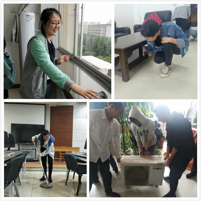 办公室打扫。同学们在打扫过程中认真负责,相互帮助。例如,以贾白为组长的小组成员均为男生,他们承担了最为辛苦的清扫任务,但是毫无怨言。在清扫过程中通常需要搬运一些重物,他们这时便会主动地帮助别人,几个人在一起以合作的方式清扫卫生。合作不仅仅可以帮助同学们更快更好的完成扫除任务,在过程中大家的心也逐渐靠拢,同学们面带微笑,气氛十分和谐美好。