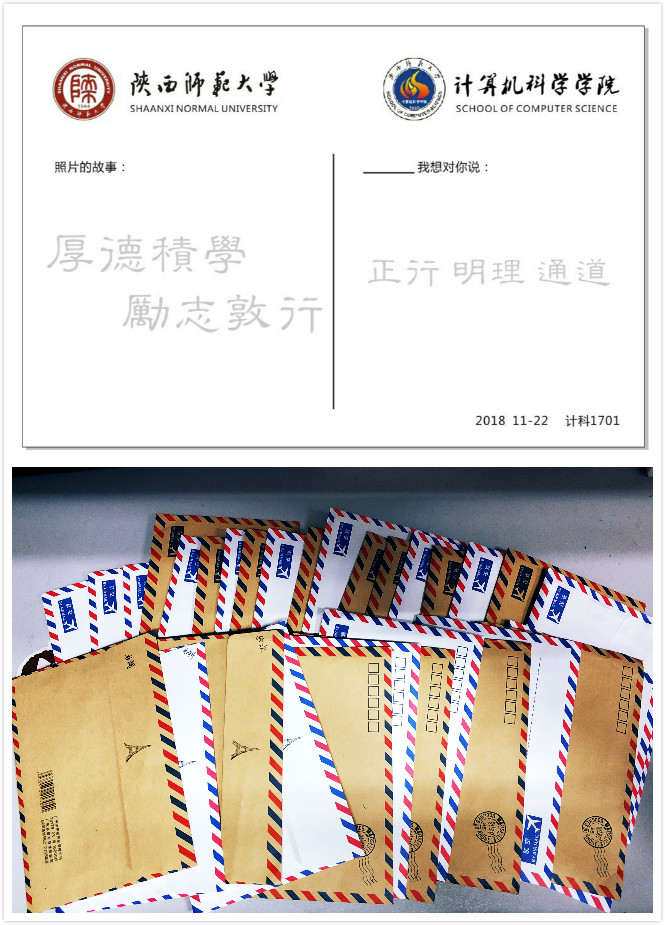 、导员、班级、同学们想说的话,在明信片的背后我们写出了自己的心声,字字句句皆是真情。这些明信片都将由团支书进行汇总送达。还有一封“写给未来的自己”的信,团支书将在毕业的时候发还给大家,给大家一个未来的惊喜。