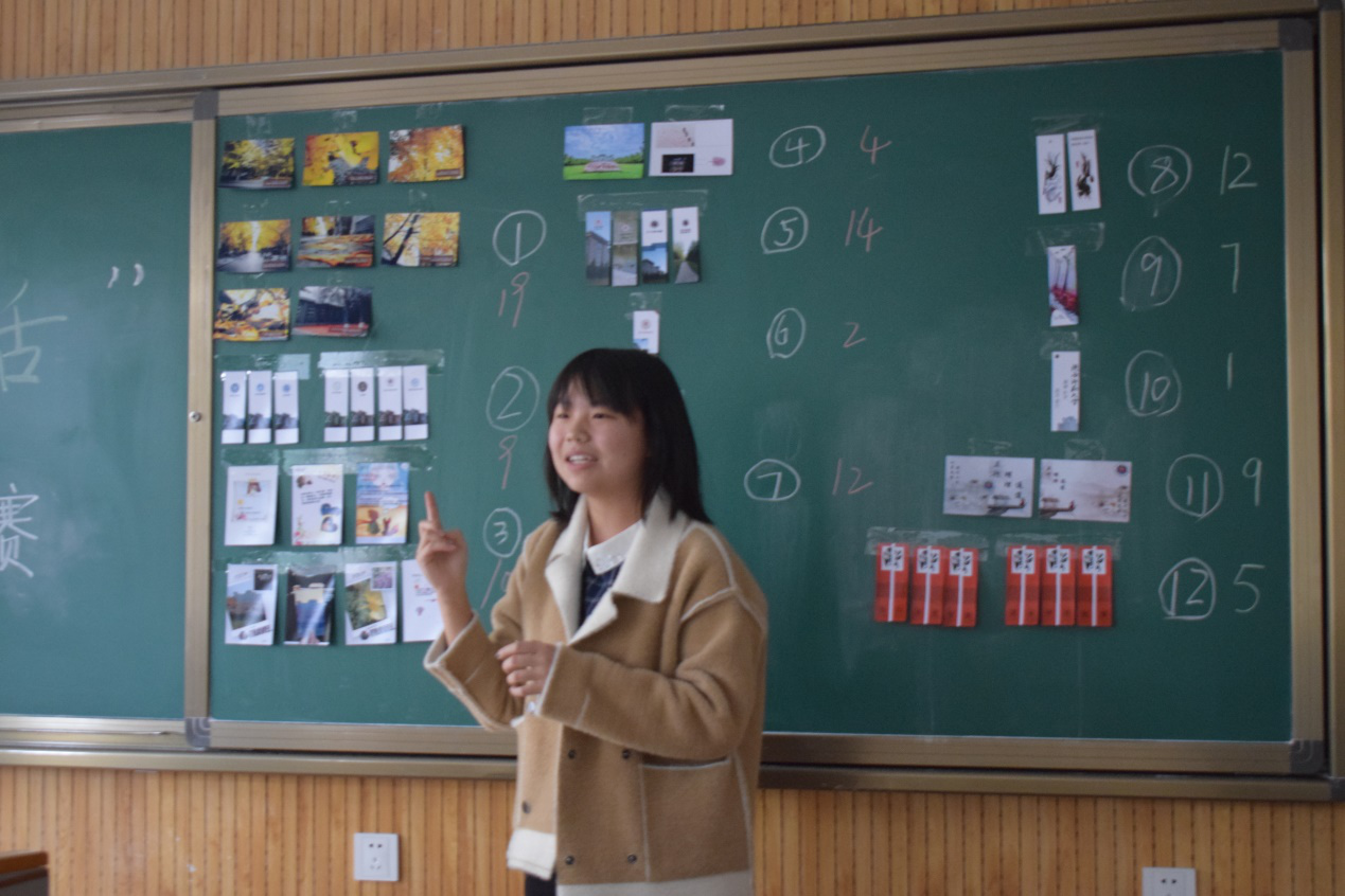 本次大赛以校园青春、传统美德、文学名著为主要题材,挑选优秀作品制作成书签、明信片或纸杯实体进行展评。会议现场,各参赛选手将设计制作而成的实物样品悬挂展示,评审依次上台近距离观看并挑选出五个最喜欢的作品进行投票。最终,主持人公布了评选结果,对12个入围选手的作品进行了点评并提出建议,票数前六名的选手获得了高校间评选大赛的参赛资格,在进一步的完善后将与其他高校的选手一决高下。