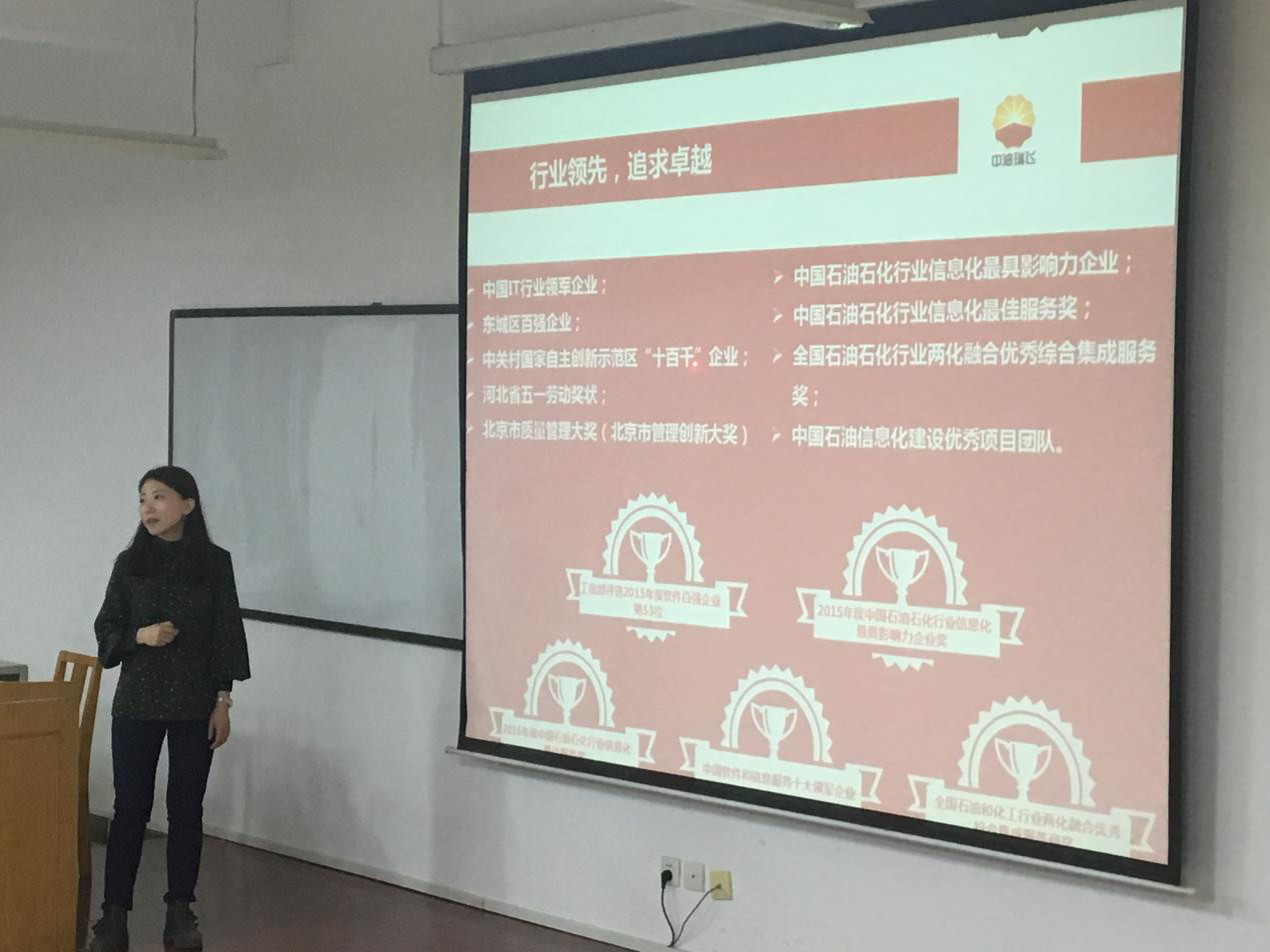 北京中油瑞飞信息技术有限责任公司是中国石油集团东方地球物理的全资子公司,是中国石油集团公司规模最大,综合实力最强的信息技术单位,主要面向能源,公共事业与金融等行业,为其提供规划,咨询,实施及运维,培训的一体化服务。会上,公司宣讲人为同学们详细介绍了公司的发展里程,核心业务范围,JBO体育,工作地点等内容,并通过图片向同学们详细展示了招聘流程,公司福利,入职待遇等内容。同学们就各自关心的问题进行了询问,公司负责人也都给予了耐心的解答。之后还进行了有奖问答环节,宣讲人就所讲内容进行提问,在得到同学们的正确答案后现场赠送了礼品,最后进入到了为时一小时的笔试环节并现场收取同学们的简历。招聘会后,部分学生与企业代表进行了更加深入的交流,至此,专场招聘会圆满结束。