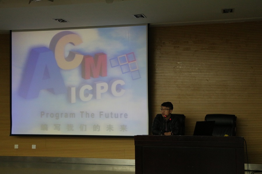 首先,我校ACM竞赛队教练王涛老师向同学们介绍了ACM-ICPC(即ACM国际大学生程序设计大赛)的竞赛规则、赛制、我校ACM队的发展历程,使在场同学了解到了这个号称“程序设计界的奥林匹克”的国际性赛事。现场大部分同学对于此项赛事表现出了浓厚的兴趣。