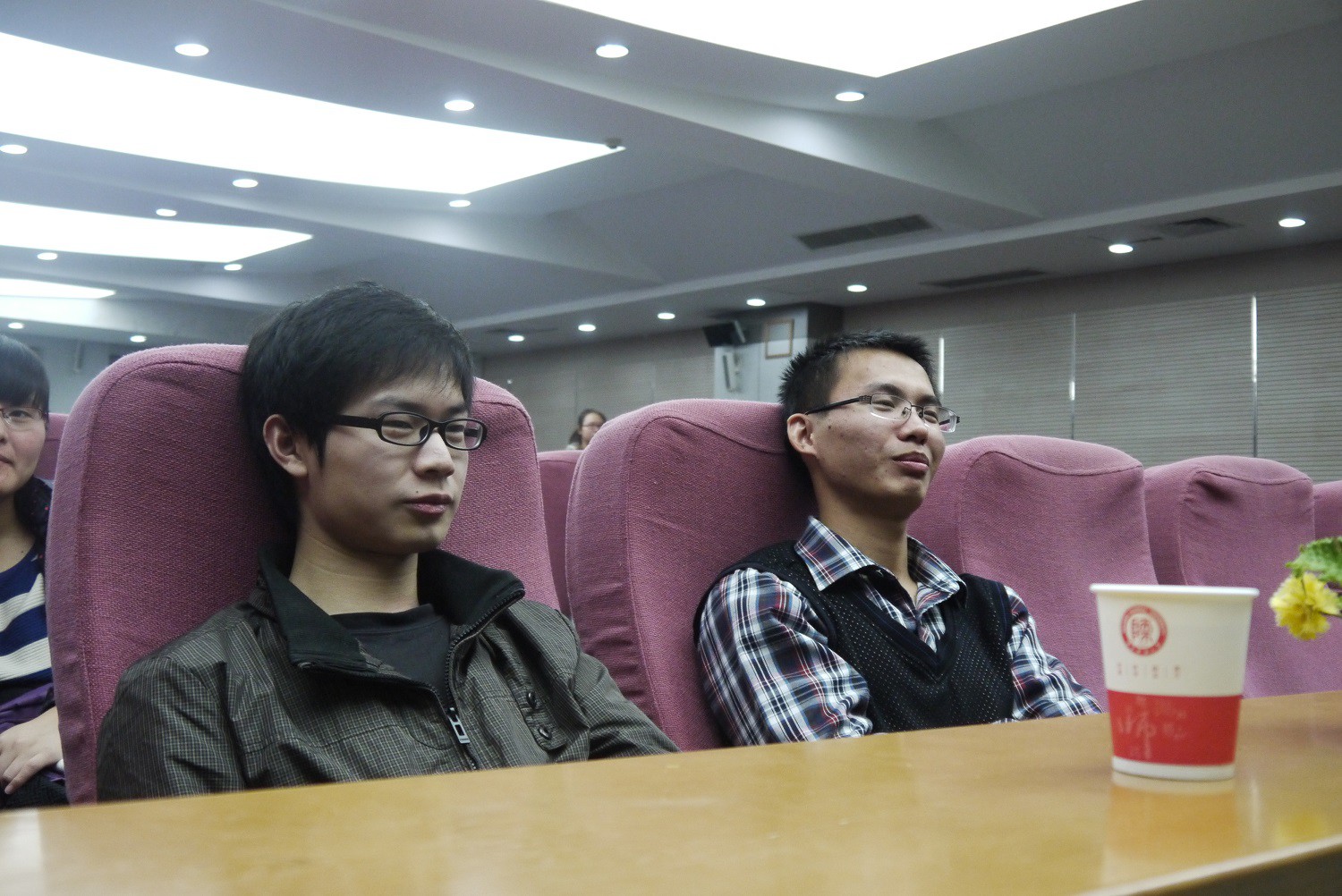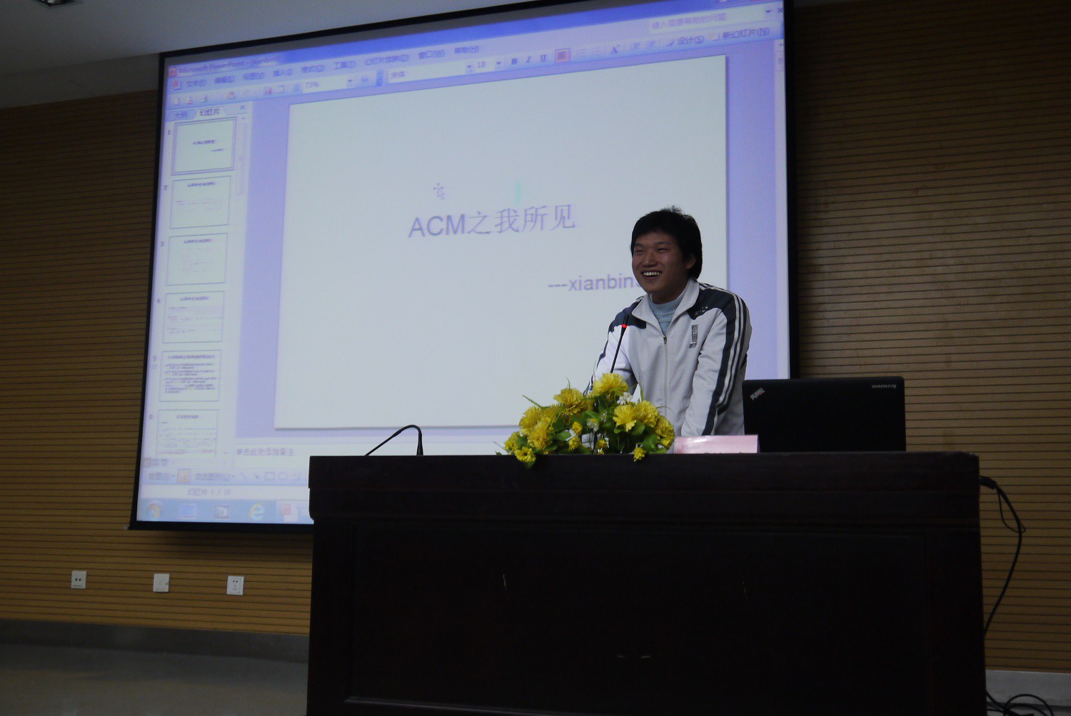 研究生欧阳显斌与在场同学分享了他的ACM竞赛之路。欧阳同学言语幽默且充满自信,处处流露出对ACM这项赛事浓厚的兴趣和深深的热爱,他也用自己身边的实例向大家展示了参加ACM比赛对个人能力培养和发展带来的好处。他与在座同学分享的人生信条:“大半失败者是因为快成功的时候放弃了。想成功就要坚持!”赢得了全场的喝彩。