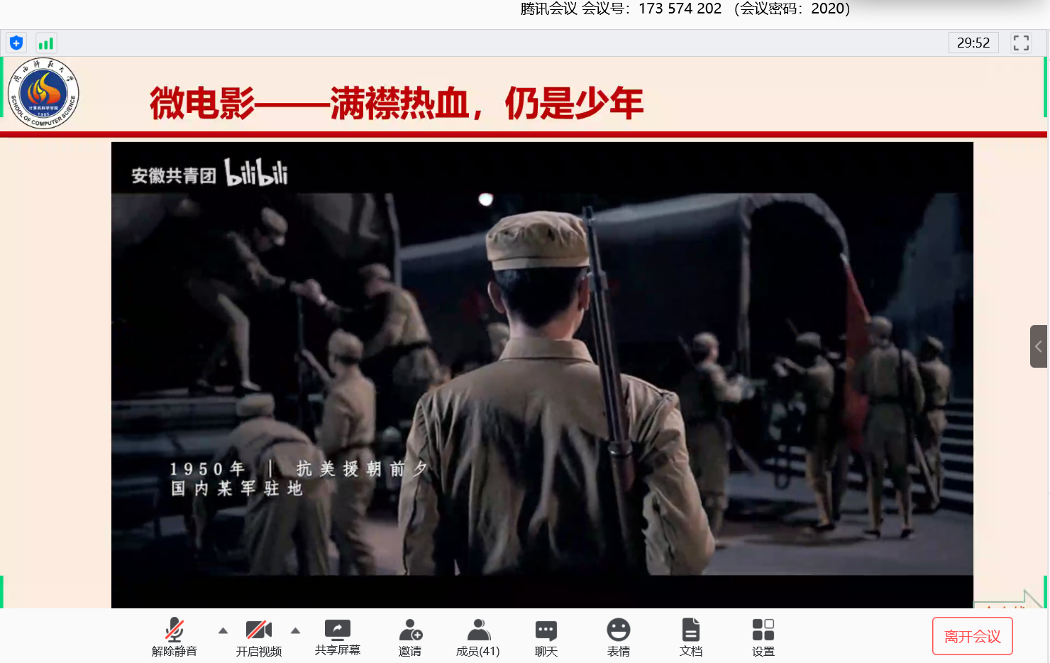 决赛分为两轮,在腾讯会议平台上开展。第一轮为团队赛,共有24道单选题。各参赛团队反应迅速,踊跃参与,在讨论区发送组号进行抢答。经过激烈的比拼,共有15名选手晋级第二轮个人战,选手们轮流回答单选、多选、填空和论述题,刘真、甘毓琪等同学在论述环节的发言旁征博引,充分体现了当代大学生的风采担当与过硬的思想政治素质。全体参赛选手还共同学习了复旦大学中国研究院院长张维为先生的演讲《中国的自信一代》,更加坚定了与时代一起成长、与国家一起崛起的信心。