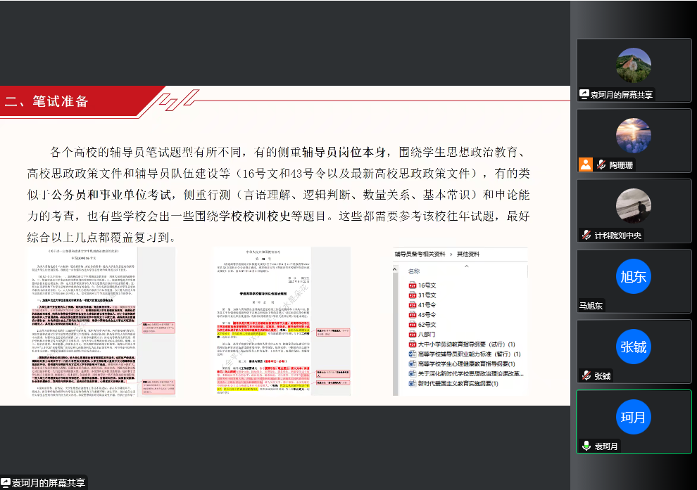 袁珂月围绕“辅导员岗位如何备考”这一主题,从信息收集、笔试准备、面试准备三个方面展开分享。她结合自身经历鼓励同学们备考辅导员时,要充分利用公众号、网络平台、交流群等渠道搜集、获取信息。在笔试和面试经验分享时,她详细介绍了辅导员考试题型、考试内容、面试流程等内容,并鼓励同学们在备考过程中要坚定信心,认真面对每一次笔试、面试。