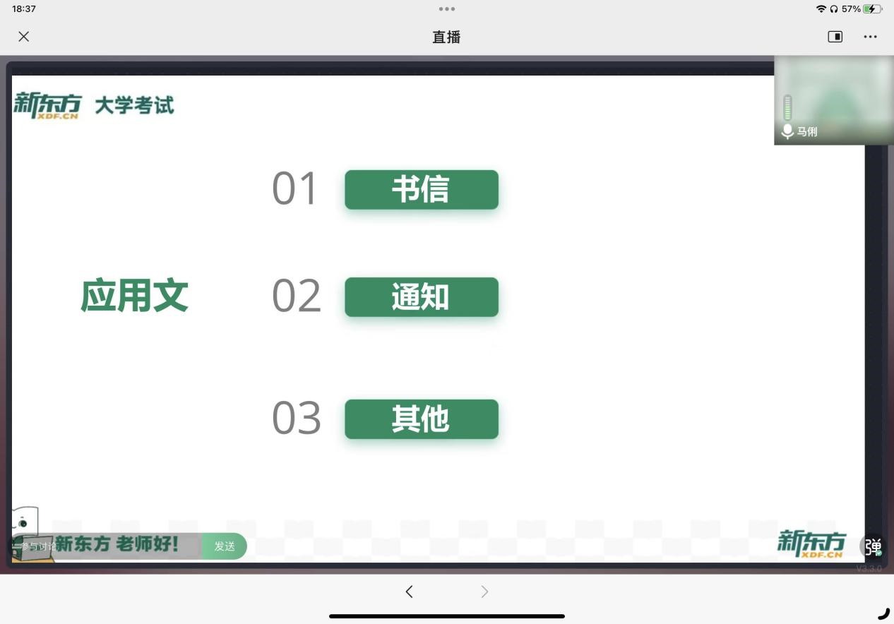 经验分享环节,马俐向大家介绍了考研英语各部分题型的比重,说明了考研英语作文的重要性,讲述了考研英语大作文和小作文的要求,提醒同学们要提前准备各类应用文,分享了考研英语常考的书信类型,为同学们提供了考研英语大、小作文备考的建议,并希望同学们在备考过程中将各类易考范文进行总结,形成自己的作文素材库。最后,刘柱提醒大家要明晰考研英语的目标分数,积累学习经验,在备考环节下真功夫。