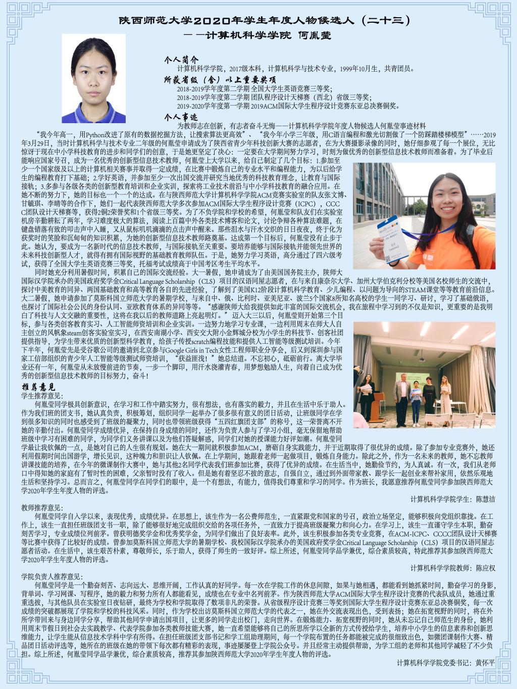 青春逢盛世,奋斗正当时——陕西师范大学2020年学生年度人物候选人JBO体育 2017级本科生何胤莹